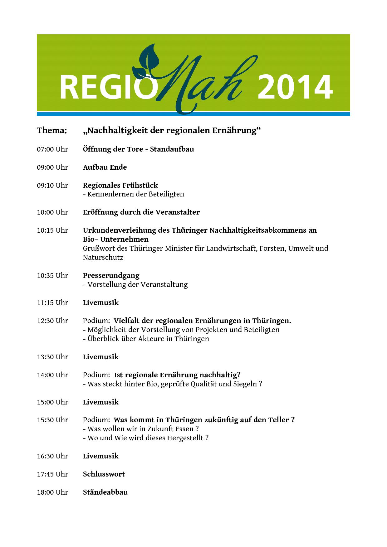 Wie nachhaltig ist die regionale Ernährung in Thüringen? Dabei werden dutzende Stände lokale Leckereien, saisonale Küche und so manch exotisches Essen oder Kraut anbieten. Kunsthandwerk, Informationsstände und Mitmachangebote runden das Programm ab. Groß und Klein finden einen Vollyballplatz, Tischkicker, Lamareiten, Abenteuerspiele und Kinderschminken, sowie eine Strandbar mit Blick über die Stadt. Die RegioNah bietet einen sommerlichen Rahmen, in dem der Ernährung aus regionalen und lokalen Quellen ein Raum zur Entfaltung geboten wird. Auf der Bühne wird es zudem Musik und Gesprächsrunden durch gesellschaftliche Akteure finden. So wollen wir uns den Fragen stellen: Ist Bio- Nachhaltig? Wie kann die Zukunft der Ernährung gestaltet werden? Wie sieht die zukünftige, lokale und regionale Ernährung in Thüringen aus?