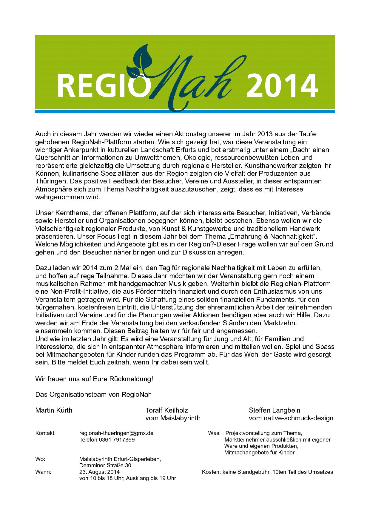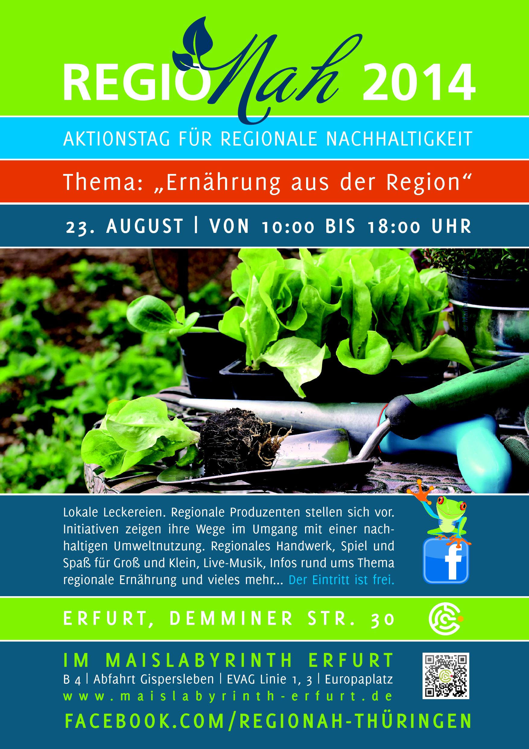 Bereits zum 2. Mal findet die „RegioNah- Thüringen“ auf dem Gelände des Maislabyrinths Erfurt, statt. Die aus abendlicher Runde entstandene Idee, dem sperrigen Begriff „Nachhaltigkeit“ mit regionalen Nutzungsformen, der Umwelt eine Plattform zu bieten, stand dabei im Mittelpunkt. Ein Aktionstag erschien damals die passendste Form unser Interesse und Ideen mit der Öffentlichkeit zu teilen und weiter zuentwickeln. Dabei bot die „RegioNah-Thüringen“ VertreterInnen von aktiven Vereinen und Verbänden, sowie regionalen Produzenten, Initiativen, Handwerkern einen organisierten Raum zum Austausch mit einer breiten Öffentlichkeit.