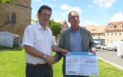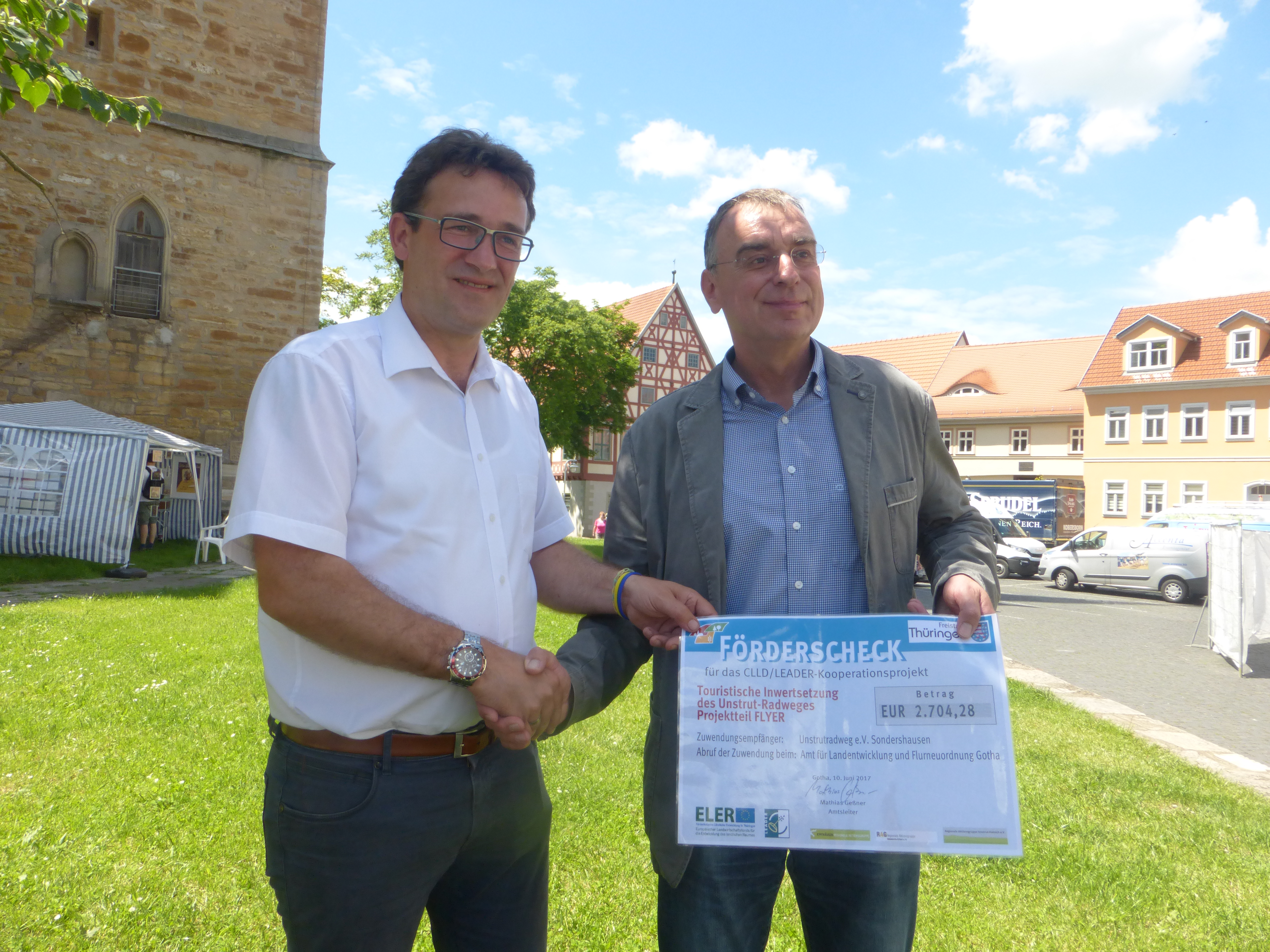 Am 10.06.2017 erhielt der Unstrutradweg e.V. in Person von Herrn Steffen Sauerbier einen Förderscheck über einen Zuschuss in Höhe von 2.700 €. Das Geld ist zusammen mit den Eigenmitteln des Vereins für die Erstellung eines Flyers zum Unstrutradweg vorgesehen. Die Übergabe fand im Rahmen des 8. Unstrut-Radwandertages auf dem Marktplatz in Sömmerda statt. Überreicht wurde der Förderscheck im Beisein von Vertretern der RAGn Kyffhäuser und Sömmerda-Erfurt von Herrn Mathias Geßner, Leiter des Amtes für Landentwicklung und Flurneuordnung in Gotha.