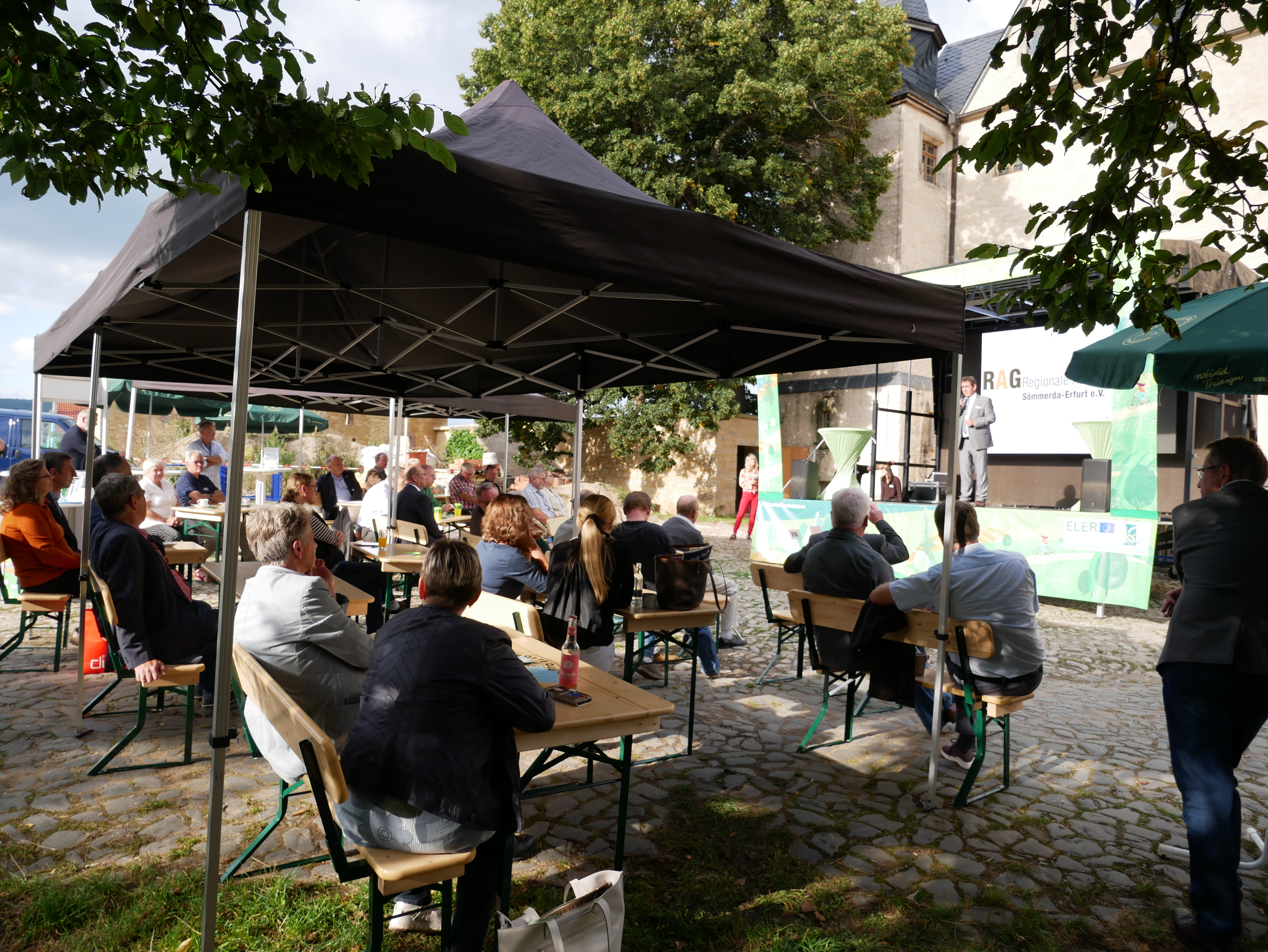 Die Veranstaltung im Rahmen der Informationstour des „LEADER-Mobils“ durch alle 15 Thüringer LEADER-Regionen nutzten der Vorsitzende der RAG Sömmerda-Erfurt, Landrat Harald Henning, LEADER-Manager Nicolas Ruge und Felicitas Bachmann vom Thüringer Landesamt für Landwirtschaft und ländlichen Raum (TLLLR), um gelungene Vorhaben in Thüringen und der Region zu präsentieren und Projektträger zu Wort kommen zu lassen. Im Austausch kamen neben den vielen Möglichkeiten der LEADER-Förderung auch deren Grenzen und Verbesserungspotentiale zur Sprache.