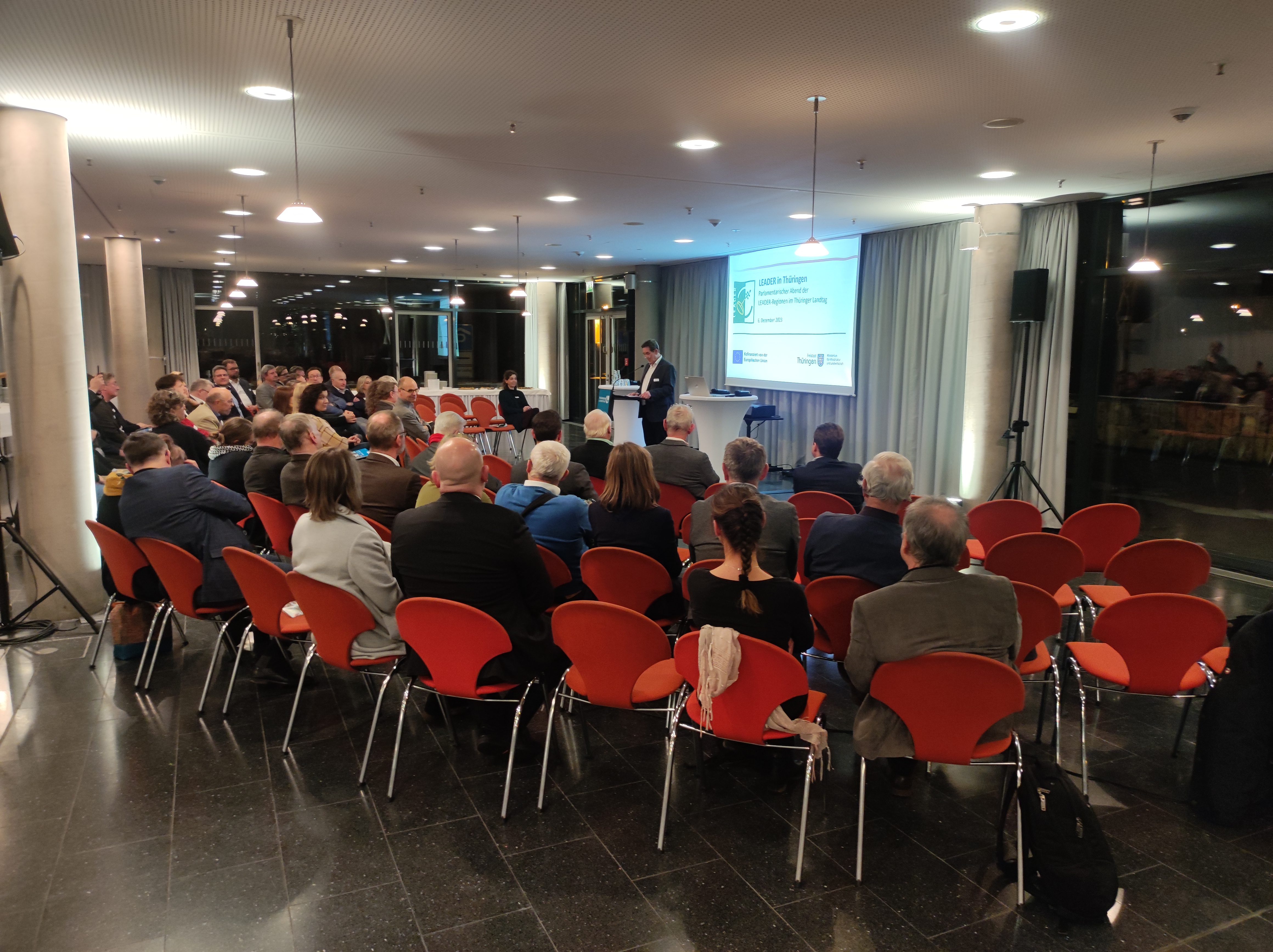 Der Vorsitzende der LEADER-Aktionsgruppe Sömmerda-Erfurt, Landrat Harald Hennig aus Sömmerda begrüßte die Teilnehmer als Vertreter der Thüringer LEADER-Aktionsgruppen und dankte besonders den vielen ehrenamtlich tätigen Bürgerinnen und Bürgern, die Verantwortung als Projektträger in Dörfern und Gemeinden und in den Thüringer LEADER-Aktionsgruppen übernehmen.