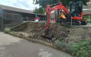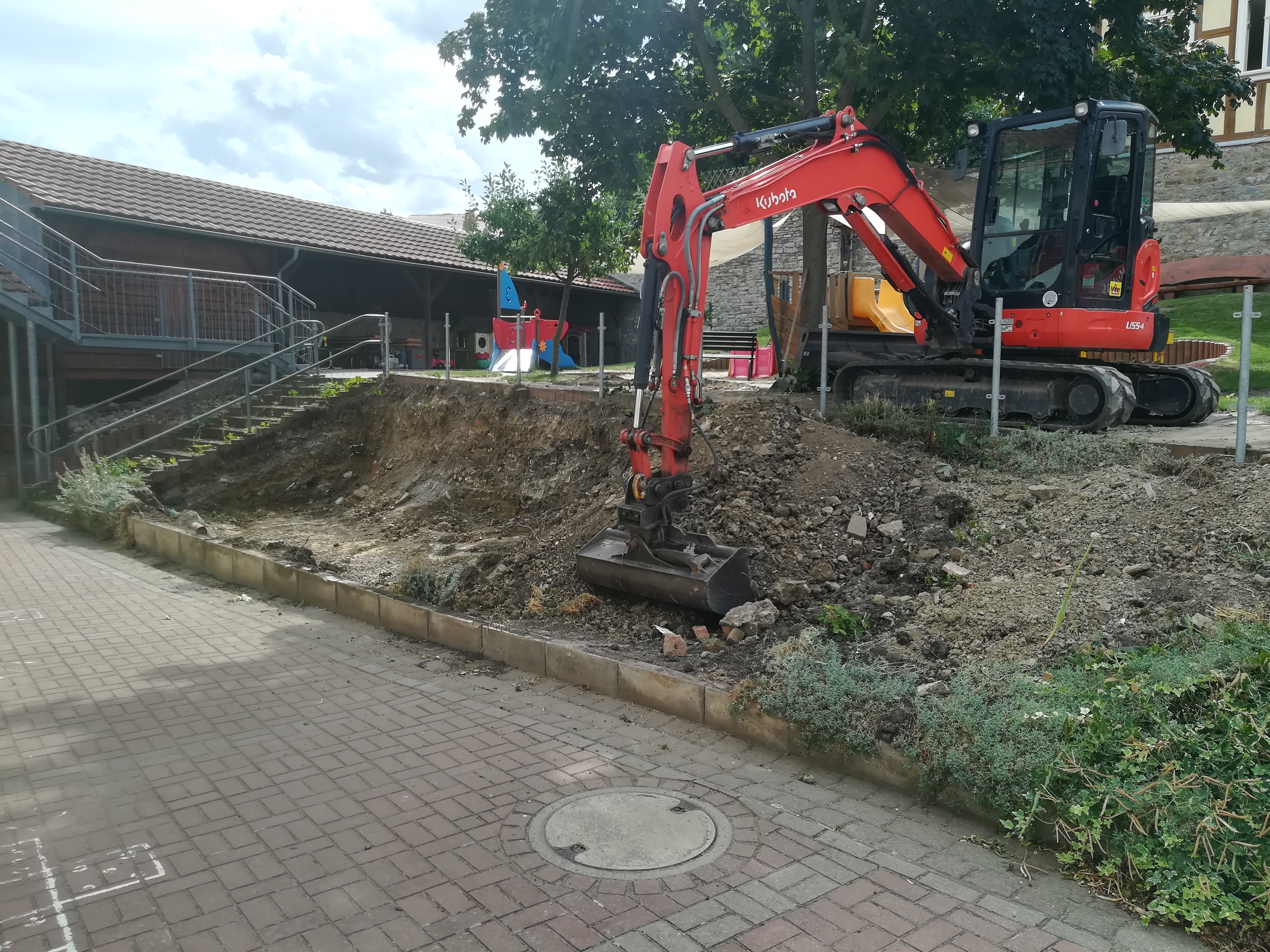 Die Arbeiten an den Außenanlagen der Kita St.Marien in Witterda laufen auf Hochtouren. Derzeit wird ein Hang abgetragen. Im Anschluss sollen zur Sicherung L-Teile eingesetzt werden.
